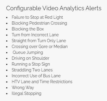 We analyze the trajectory of each vehicle in real-time, with ability to detect sudden lane changes, tailgating, driving on shoulder, queue jumping, failure to yield, illegal U-turns, and more...