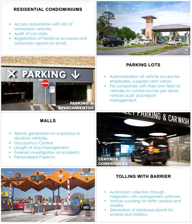 It Manages the access of authorized and restricted vehicles, recognizing license plates with a trigger (ANPR Camera , inductive loop, photocell, etc.), continuously and acting on access barriers according to entry lists, automatizing access and, if needed, improving operations integrating with several video recording systems. This way it provides to businesses or homes, safe and automatized circulation.